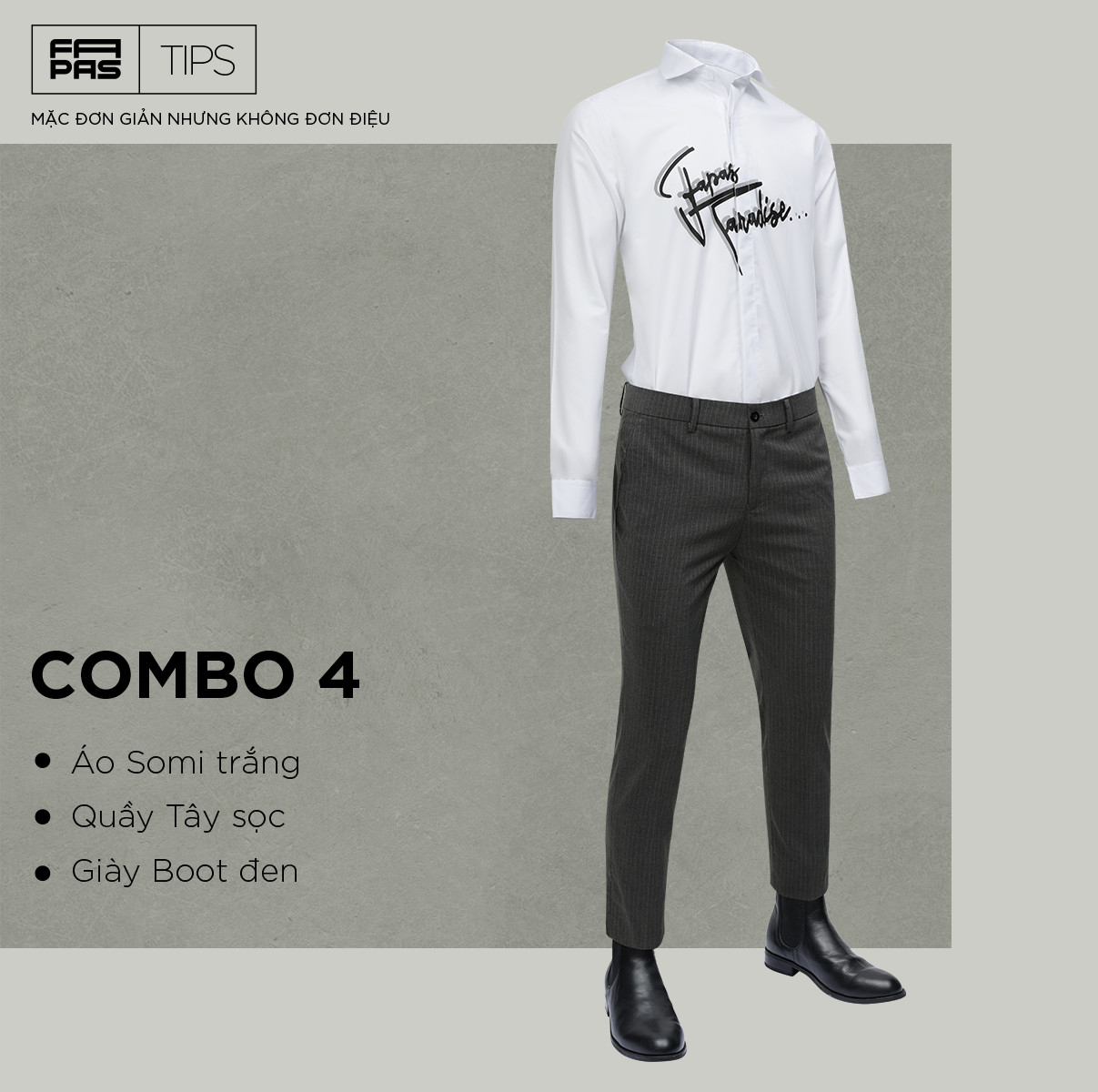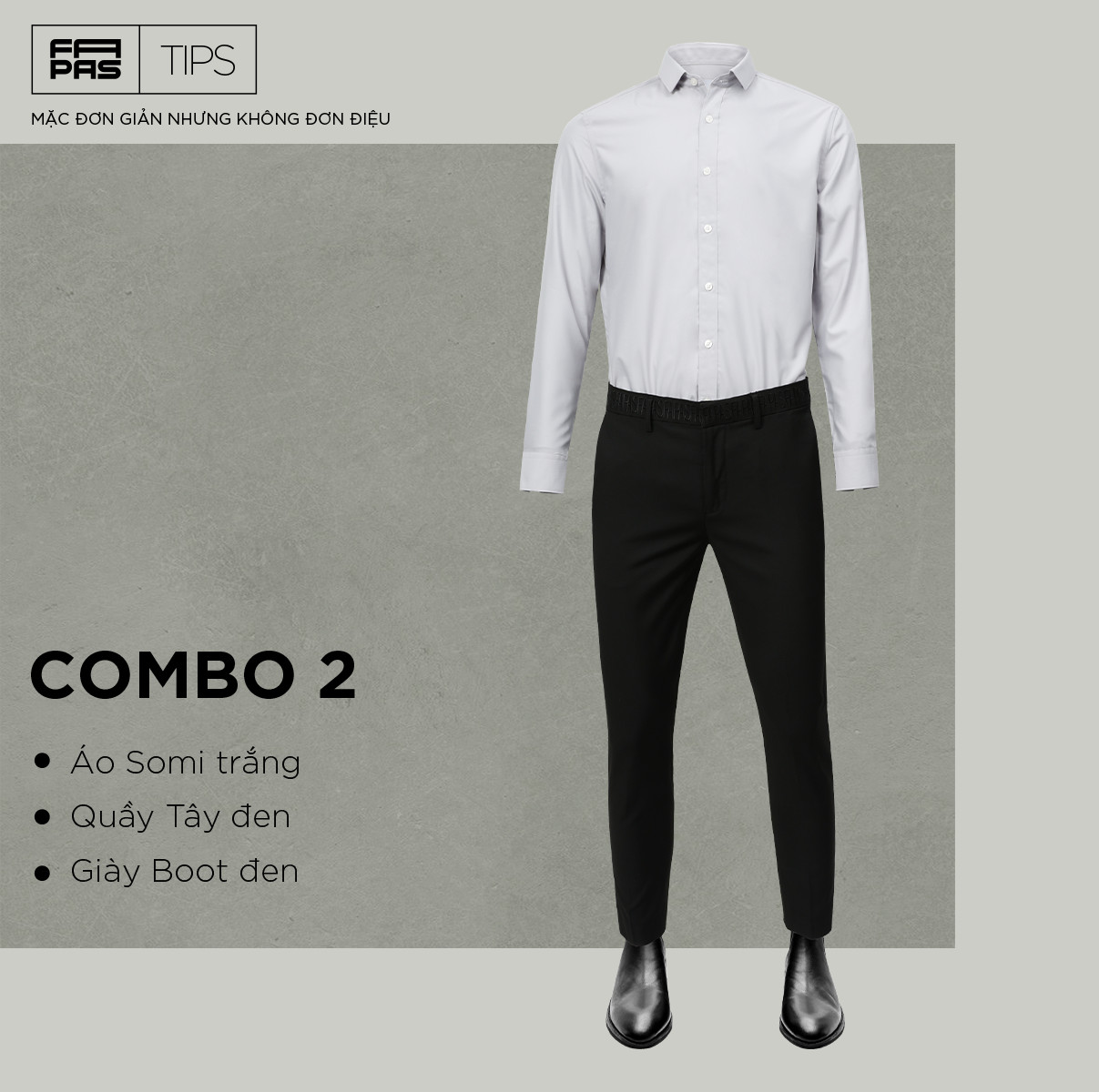 Đây có lẽ là cách mặc đồ chẳng còn lạ lẫm gì với nhiều chàng trai làm công việc văn phòng. Tone màu đen trắng thể hiện sự đứng đắn nhưng nếu chỉ thế thôi thì sẽ vô cùng đơn điệu. Chính vì thế, FAPAS gợi ý cho bạn chọn kiểu quần tây đen có điểm nhấn ở phần đai quần sẽ tạo sự mới lạ hơn. Đừng quên một đôi boot đen làm tăng chiều cao cho bạn cũng là item quan trọng giúp bạn có một phong cách công sở hiện đại.