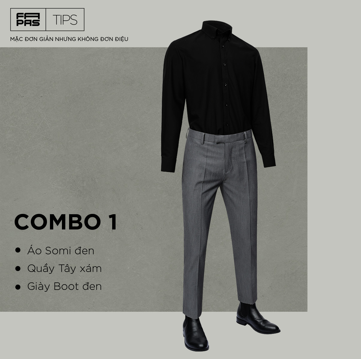 Một chiếc sơ mi đen, một chiếc quần tây xám và đôi boot đen sẽ giúp bạn trở nên lịch lãm hơn và có vẻ gì đó bí ẩn. Sự kết hợp hai tông màu này nhìn tưởng chừng đơn giản nhưng không hề đơn điệu chút nào. Ngược lại, cách phối đồ này còn giúp bạn nhìn thời trang, cuốn hút và thể hiện dáng người của bạn được đẹp hơn.